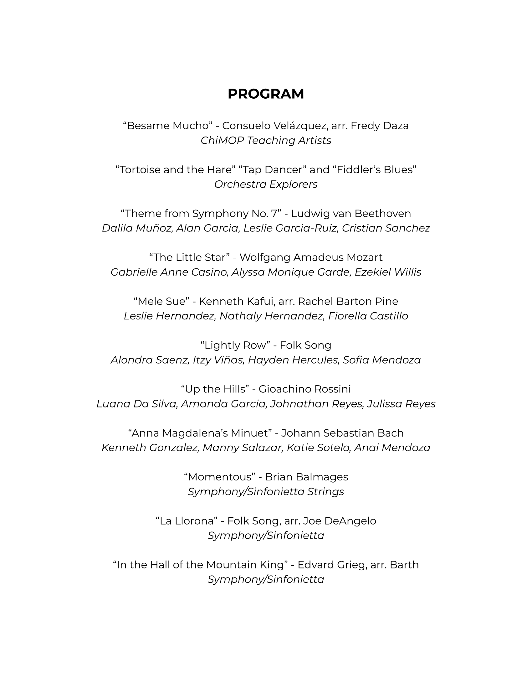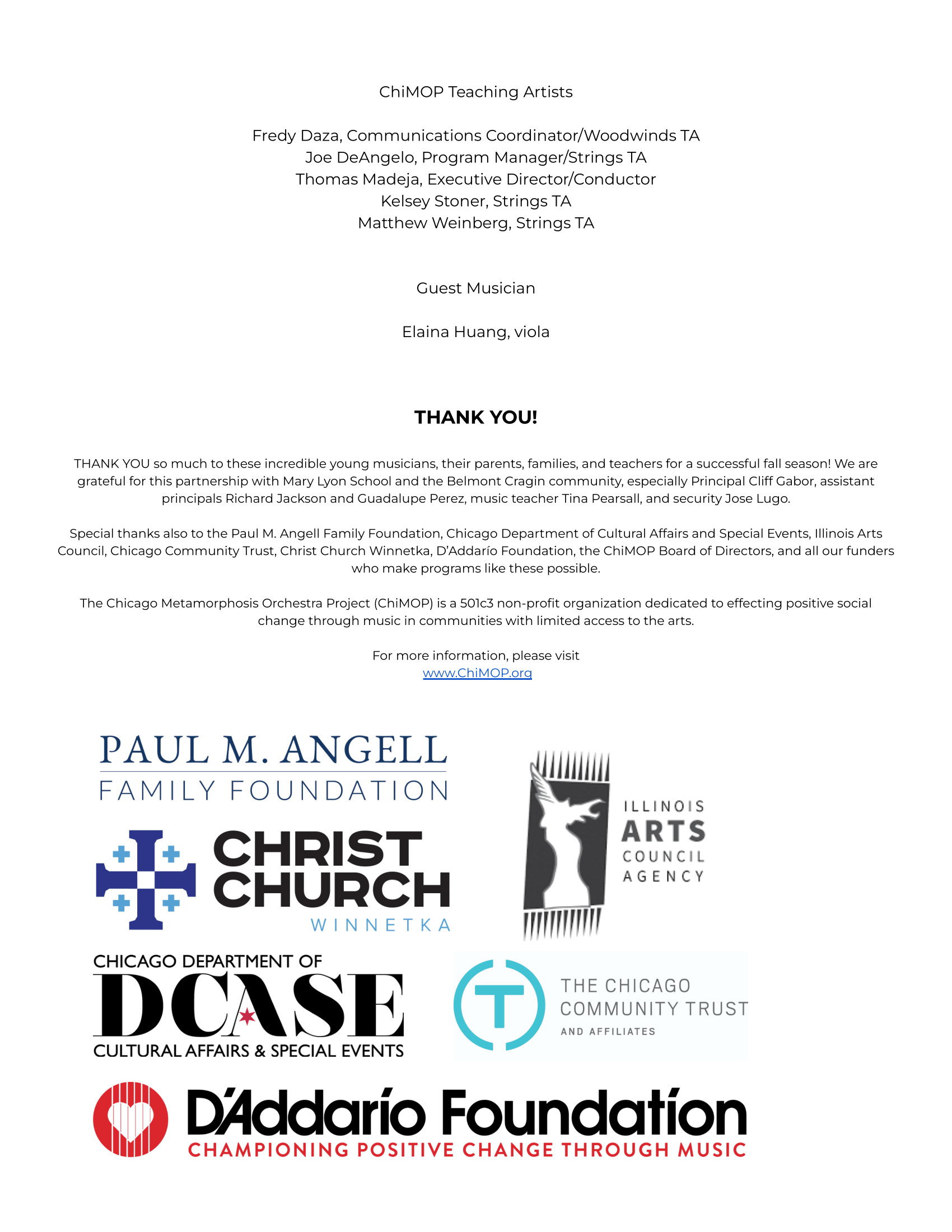 ChiMOP relies on the generosity of donors like you to support the work of building community through music. A 501c3 organization, all donations are tax deductible. Donate online today.
